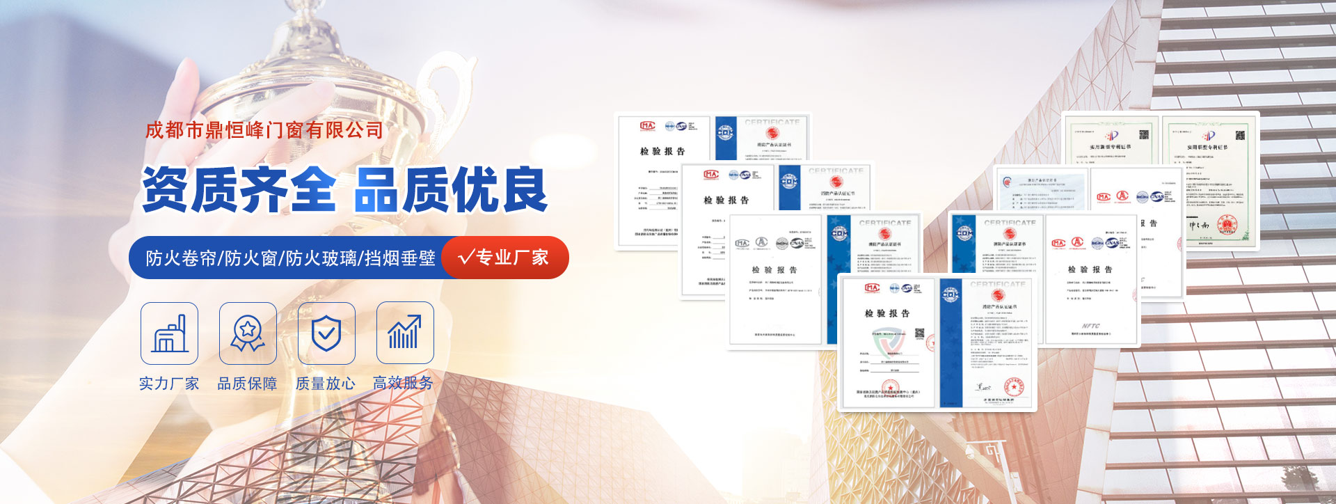 成都市鼎恒峰門窗有限公司公司擁有的生產(chǎn)、檢測(cè)設(shè)備和一支實(shí)力雄厚、經(jīng)驗(yàn)豐富的設(shè)計(jì)研發(fā)、管理、生產(chǎn)、銷售、安裝及售后服務(wù)的戰(zhàn)狼團(tuán)隊(duì),有完善的綜合配套服務(wù)能力。公司主要生產(chǎn)、銷售以下系列產(chǎn)品:防火卷簾系列、防火窗系列、防火玻璃系列、擋煙垂壁系列產(chǎn)品。其產(chǎn)品已通過國(guó)家防火建筑材料質(zhì)量監(jiān)督檢測(cè)中心合格,并順利取得了國(guó)家應(yīng)急管理部消防產(chǎn)品合格中心自愿性證書。其中生產(chǎn)銷售的組合式特級(jí)防火卷簾在同行中名列前茅,得到用戶的認(rèn)可和好評(píng)。 公司秉承“誠(chéng)信、開拓、高效、的企業(yè)理念,...